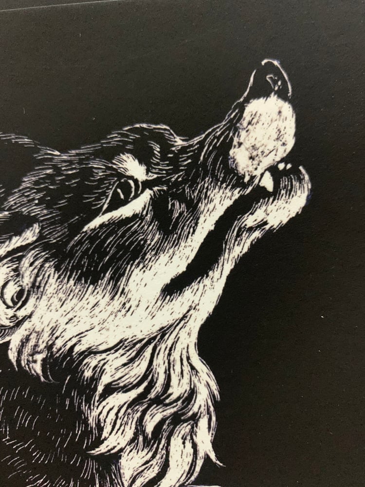 This design was made on scratchboard, where black ink is scraped away to show the white beneath, describing a lonely nocturnal scene with fine white lines.